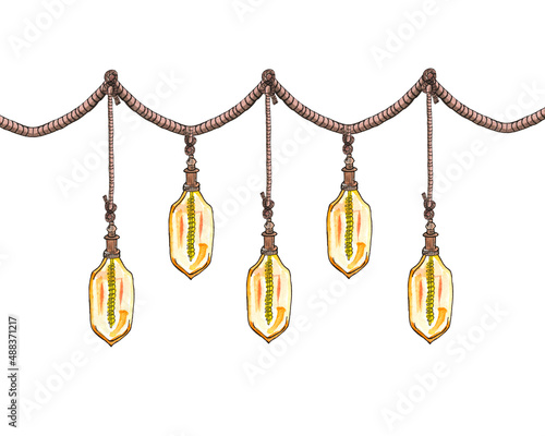 Watercolor illustration. Edison lamps, loft style in interior modern loft style , vintage on a rope.