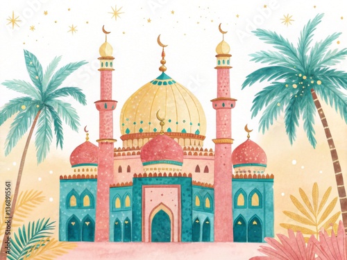 mosque, islamic, architecture, watercolor, illustration, art, muslim, religion, islam, palm tree, arabic, dome, minaret, pink, teal, gold, pastel, peaceful, serene, beautiful, spiritual, cultural, tour tourism, travel, digital artwork, decorative, ramadan, eid, children, faith, prayer, vintage, cute, fantasy, hand-drawn