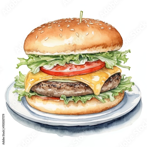 cheeseburger, burger, hamburger, beef, patty, cheese, tomatoes, lettuce, bun, plate, white plate, watercolor, illustration, food, fast food, meal, dinner, lunch, snack, delicious, tasty, juicy, appetising, comfort food, classic, traditional, fresh, ingredient, isolated, white background, artwork, art, painting, realistic, detailed, drawing, eatery, menu, graphic, design, culinary, gastronomy, epicure, mouth-watering