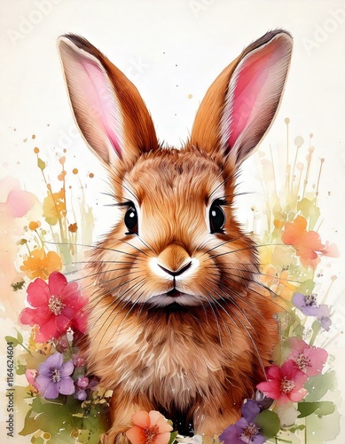 Watercolor illustration of a cute fluffy brown rabbit with pink ears in a blank background with colorful flowers