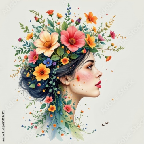 profile, portrait, artwork, watercolor, painting, flower, plant, face, colourful, vibrant, nature, beauty, artistic, whimsical, botanical, feminine, decorative, serene, soft, fluid, delicate, dreamy, fantasy, surreal, growth, organic, calmness, peaceful, ai, generative