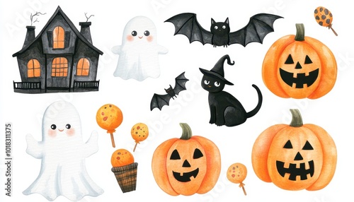 halloween, illustration, watercolor, icon, ghost, skittish, pumpkin, scarey, black, cat, bat, sorcerer, hat, candy, lollipop, orange, cute, festive, decor, party, season, trick, treat, autumn, fall, friendly, isolated, white, background