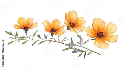Watercolor illustration of orange flowers and coreopsis botanical painting with detailed foliage