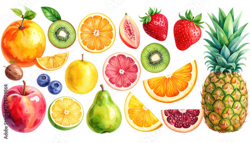 fruit, watercolor, isolated, white, pineapple, apple, orange, kiwi, strawberry, pear, blueberry, grapefruit, slice, healthy, food, fresh, tropical, sweet, delicious, vitamin, ripe, nature, background, design, collection, set, organic, colourful, diet, vegan, vegetarian, nourishment, juicy, citrous, summer, dessert, illustration, art, cut, leaf