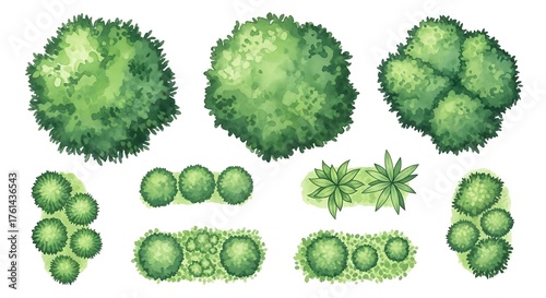 tree, bush, plant, green, foliage, garden, landscape, design, watercolor, illustration, topview, overhead, nature, botany, vegetation, park, element, graphic, drawing, art, shrub, round, circular, oval, organic, natural, environment, ecology, growth, leafy, dense, texture, pattern, variety, collection, set, assortment, architectural, plan, blueprint, diagram, mapping, aerial, perspective, fresh, vibrant, lush, healthy