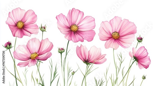 Watercolor Illustration set of Pink cosmos flowers on a white background,spring summer nature,Vibrant pink cosmos blooming,Children's card,banner,raindrops drawn by hand.
