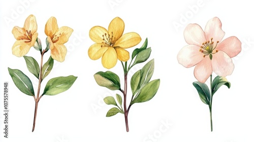 Watercolor illustration spring blossom flowers with soft yellow and pink hues green leaves isolated on white background