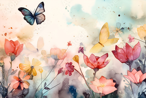 meadow, flower, butterfly, nature, summer, spring, plant, watercolor, background, growth, freshness, idylli, springtime, botany, field, many-coloured, rural scene, tranquil scene, uncultivated, wildflower, blossom, flower head, season, lawn, scenery, generative, ai, illustration