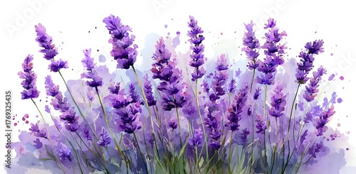 Watercolor lavender flowers with splashes and splatters on white background, purple wildflowers meadow arrangement in loose artistic style for wedding stationery.