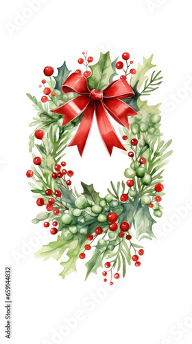 christmas, celebration, holly, chaplet, holiday, winter, decorative, card, illustration, design, red, symbol, berry, border, round, leaf, bow, greeting, element, year, new, christmas, watercolor, tree branch, green, pine, tree, frame, mistletoe, merry, background, season