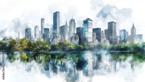skyline, city, new york city, city landscape, park, central park, watercolor, painting, art, illustration, view, landscape, panorama, urban, architecture, building, skyscraper, modern, city landscape, nature, tree, parkland, water, lake, duck pond, misty, morning, sunrise, artistic, impressionist, drawing, digital, new york city, america, tour tourism, travel, famous, iconic, beautiful, tranquil, peaceful, aesthetic, photo, poster, print