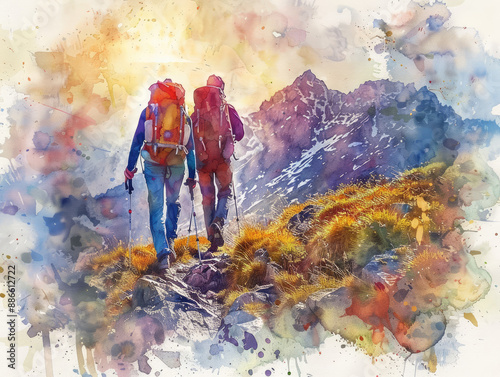 watercolor painting hikers traversing rocky trails