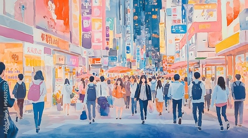 watercolor, painting, street scene, japan, city, urban, people, crowd, bustling, tied-up, walking, shopping, travel, tour tourism, culture, asian, japanese, architecture, building, signs, neon, light, vibrant, colourful, lively, energy, atmosphere, perspective, abstract, illustration, artwork, art, graphic, design, digital artwork, print, poster, background, wallpaper, banner, graphic design
