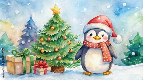 watercolor, painting, penguin, christmas tree, gift, ribbon, pine cone, red bow, festive, holiday, winter, cute, snowy, seasonal, celebration, whimsical, art, decoration, animal, traditional, symbol, nature, hand-made, creative, adorable