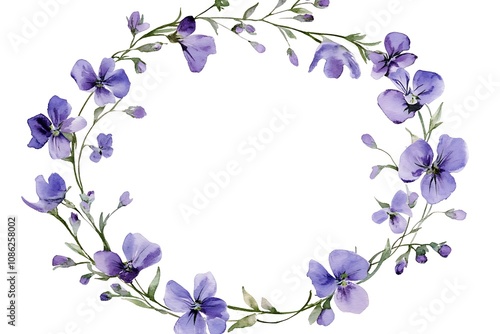 watercolor, painting, purple, flower, chaplet, floral, design, art, botanical, illustration, delicate, romantic, elegant, nature, beauty, blossom, bloom, flower petals, leaf, stem, branch, bud, green, white, background, circle, frame, border, decoration, vintage, graphic, pattern, texture, spring, summer, garden, wildflower, violet, pansy, soft, subtile