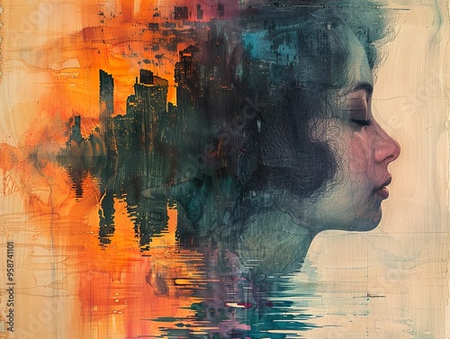 woman, profile, city landscape, hair, watercolor, painting, art, abstract, urban, modern, contemporary, dream, imagination, surreal, fantasy, feminine, beauty, peace, calmness, soul, mind, thought, feeling, emotion, creativity, inspiration, hope, future, city, building, sky, water, colours, vibrant, colourful, artistic, style, design, texture, background