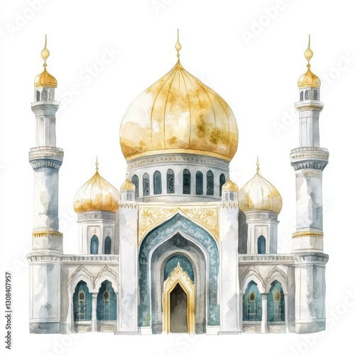 islamic, ramadan, mosque, architecture, watercolor, painting, gold, dome, art, minaret, architectural, illustration, religious, building, muslim, gold, white, blue, teal, ornate, detailed, elegant, grand, majestic, spiritual, faith, religion, culture, tradition, prayer, worship, peace, serenity, travel, landmark, design, image, graphic, visual, artwork, place, of, detail, symbol