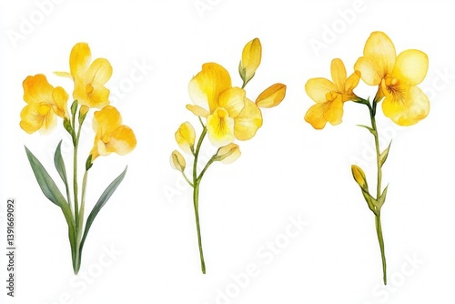 Watercolor painting of delicate yellow freesia flowers with green stems, botanical illustration style.