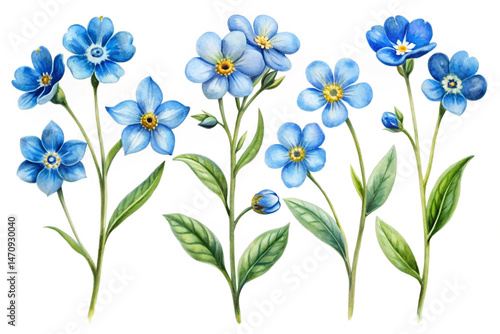 flower, blue, watercolor, painting, floral, botanical, illustration, nature, spring, summer, artwork, leaf, stem, delicate, isolated, white background, art, design, element, beautiful, bloom, blossom, garden, wildflower, myosotis, closeup, detailed, romantic, fresh, growth, flora, seasonal, natural, decorative, drawing, artistic, pretty, vibrant, elegant, botany