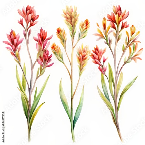 Watercolor Painting of Three Red and Yellow Indian Paintbrush Flowers, watercolor painting, wildflower, floral illustration, botanical art, Indian paintbrush, flower
