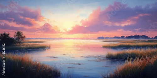 watercolor painting of tranquil marshland at dawn with mist water vibrant sky and detailed grasses