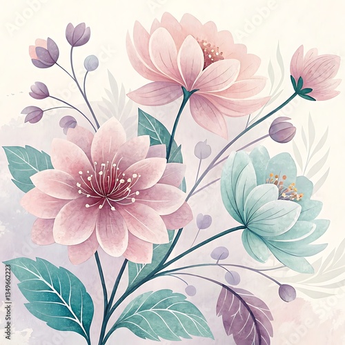 Watercolor Pastel Floral Illustration: Pink Flower with Teal Leaves, Gentle Blooms, Beige Background - Soft, Dreamy Art Print..