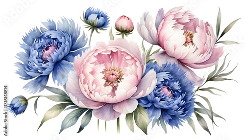 watercolor, flower, peony, bouquet, floral, arrangement, blue, pink, pastel, delicate, romantic, elegant, beautiful, blossom, bloom, flower petals, leaf, greenery, botanical, spring, summer, wedding, invitation, card, nature, decoration, feminine, soft, pretty