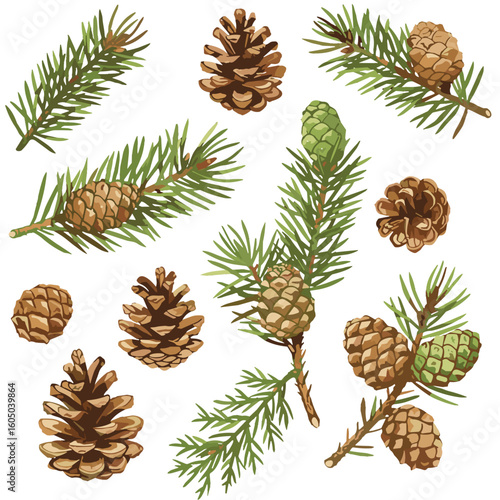 pine, cone, conifer, watercolor, illustration, branch, pine cone, fir, spruce, cedar, botanical, green, brown, clip art, isolated, nature, forest, plant, white background, earthy, realistic, detailed, no people, hi-res, foliage, timberland, evergreen, natural, autumn, winter, rustic, seasonal, collection, hand-made, decor, craft, holiday, tree, open, closed, dry, fresh, element, design, forest floor, flora