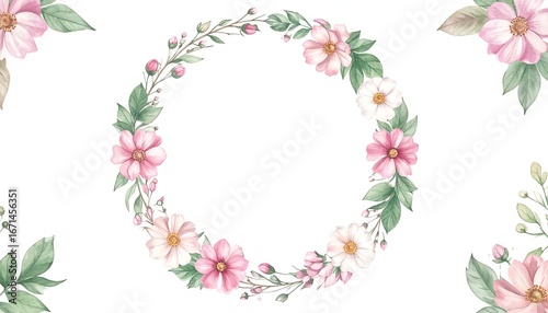 watercolor, chaplet, flower, pink, white, green, leaf, floral, botanical, wedding, invitation, card, design, background, romantic, elegant, delicate, spring, summer, nature, art, illustration, painting, frame, border, circle, pattern, texture, soft, pastel, pretty, beautiful, feminine, cute, sweet, fresh, vibrant, colourful, decorative, creative, artistic, stylish, trendy, modern, vintage, rustic, shabby, chic, hand-made