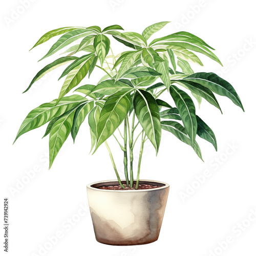Watercolor plant Pachira in a pot isolated on a white background