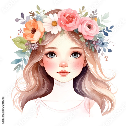 Watercolor portrait of a beautiful young girl wearing a delicate floral crown with colorful blossoms and leaves, digital illustration.