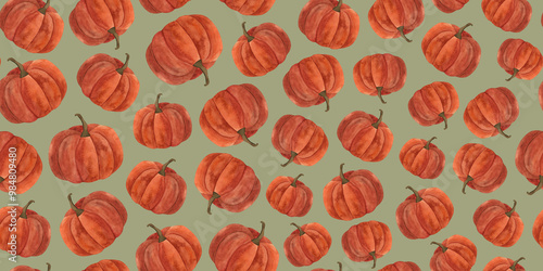 Watercolor pumpkin autumn 2024 seamless pattern For Halloween decoration wallpaper wrapping paper Cozy hand drawn endless print design on green background Harvest festival Ripe gourd Vegetable