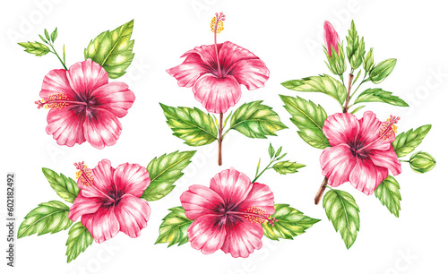 Watercolor red hibiscus set on a white background