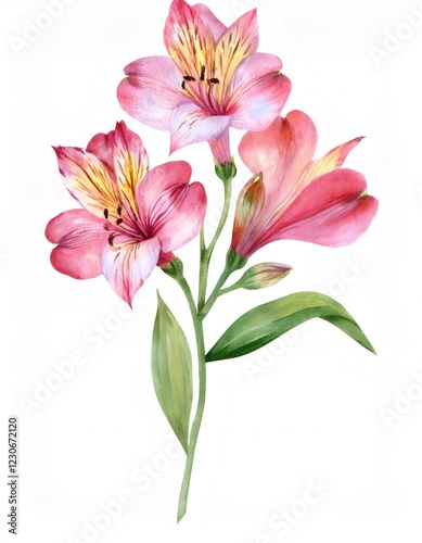 Watercolor rendering pink alstroemeria blooming, yellow white striped petals against verdant green foliage