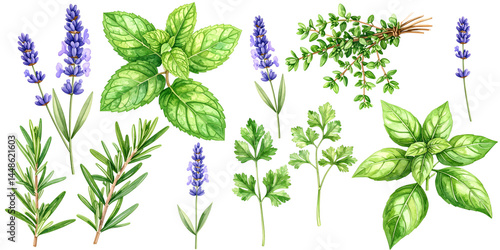 Watercolor set of fresh culinary herbs and flowers including rosemary, lavender, mint, thyme, parsley, and basil