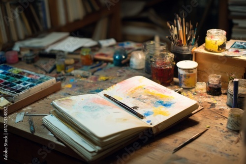 Watercolor sketchbook, paintbrushes, and assorted jars sit on a paint-splattered wooden table in a painter's studio