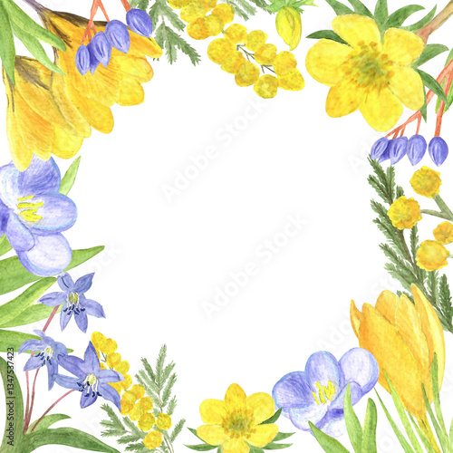 Watercolor spring first flowers, hand-drawn illustration, frame of flowers