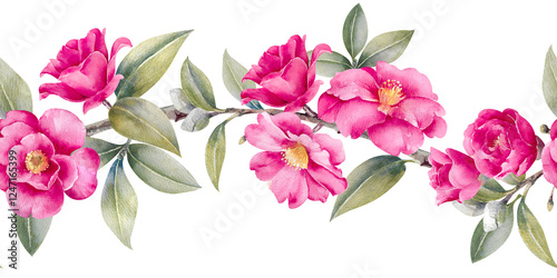 camelia, spring, pink, flower, watercolor, seamless, border, clip art, illustration, bud, leaf, pastel, green, hand-drawn, isolated, colourful, beauty, valentine, wedding, camelia, romantic, blooming, invitation, rose, summer, nature, background, template, vintage, design, art, floral, artwork, botanical, blossom, plant, shop, tree branch, paint, textile, print, wallpaper, fabric, interior, tablecloth, scrapbooking, endless, garden