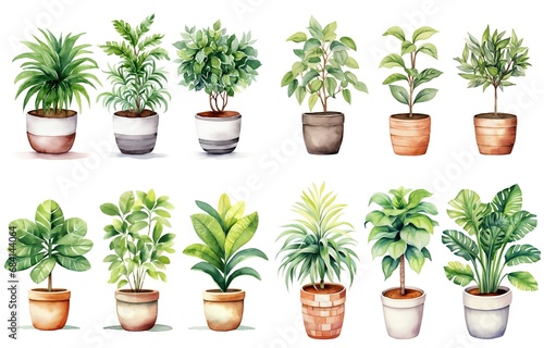 watercolor style illustration of various type of tropical foliage pot plant summer collection set isolated on white background, Generative Ai