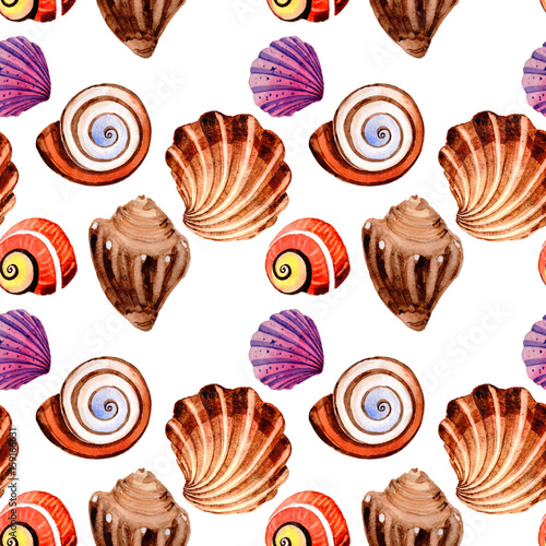Watercolor summer beach seashell tropical elements pattern, underwater creatures.