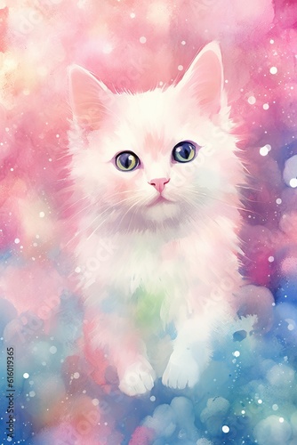 watercolor techniques to paint a cat print that has soft and fluid brushstrokes. subtle splashes of color to create a dreamy and ethereal effect . Cute cat