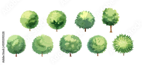 Watercolor Tree Collection in Front View for Landscape Architecture and Garden Design.