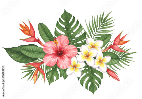 isolated, flower, tropical, floral, leaf, hibiscus, plumeria, arrangement, bouquet, red, green, white, watercolor, illustration, design, nature, exotic, summer, botanical, leaf, hawaii, tropical flower, decoration, jungle, orange, frangipani, blossom, plant, palm, monstera, vibrant, element, drawing, background, art, vector, beauty, bright, closeup, flora, seasonal, holiday, artwork, bloom, decorative, image, natural, pattern