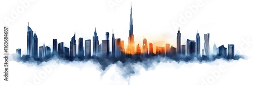 Watercolor vector illustration of a modern city skyline with smoke and fog on a white background