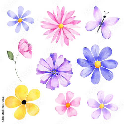 Watercolor violet and pink flowers, floral illustration for greeting card, invitation and other printing design. Isolated on white. Hand drawing.