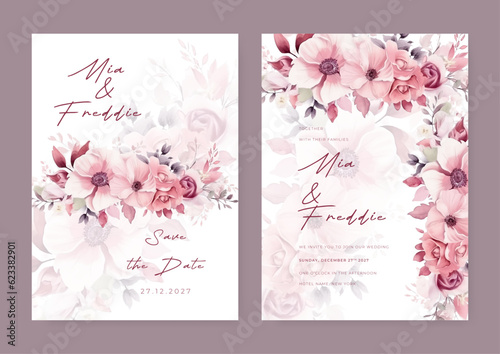 Watercolor wedding invitation card template with pink and purple floral and leaves decoration