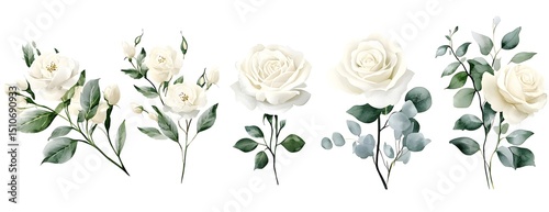 Watercolor white floral bouquet with roses, peonies, and eucalyptus leaves on an isolated background, a clipart illustration in a soft beige color palette, with no shadows,