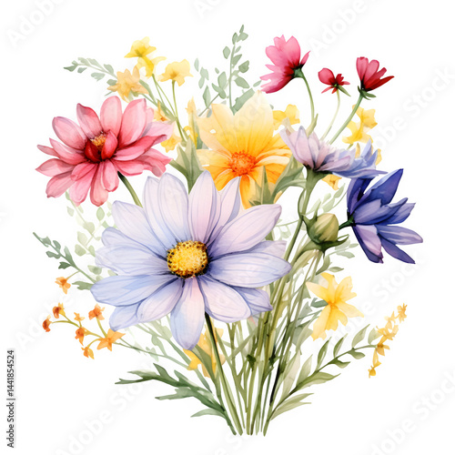 wildflower, flower, bouquet, watercolor, elegant, spring, wedding, invitation, floral, botanical, painted, illustration, art, graphic, design, colourful, pastel, pink, purple, yellow, white, green, leaf, arrangement, isolated, cut-out, delicate, romantic, artistic, nature