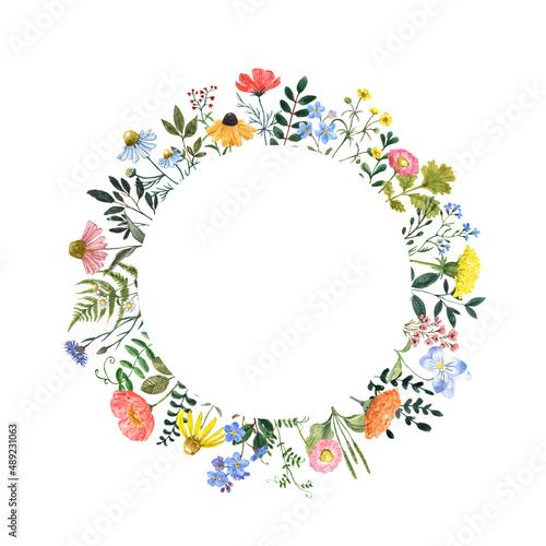 Watercolor wildflowers circle frame on white background. Summer meadow floral wreath. Holiday card template illustration with colorful plants and leaves.
