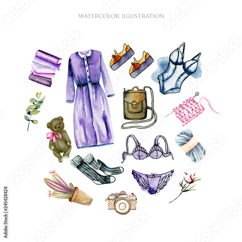 fashion, clothing, woman, modern, shop, clothes, design, classic, collection, model, wear, beauty, stylish, textile, fabric, clothes rack, clothes, costume, female, glamour, feminine, drawing, trendy, girl, beautiful, watercolor, woman, casual attire, elegant, element, accessory, summer, skirt, gown, frock, apparel, silhouette, isolated, set, bag, shoe, dress, lingerie, corset, smart, purple